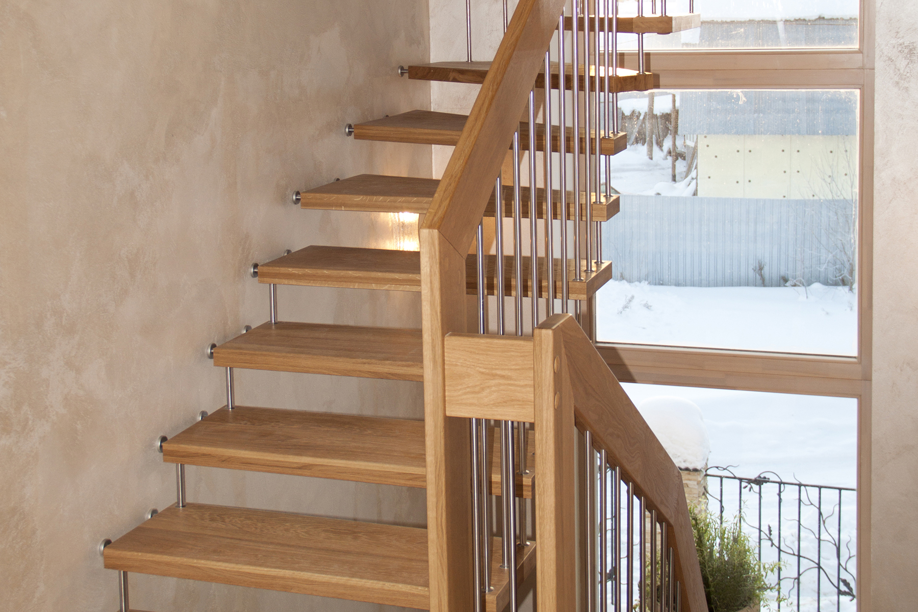 Эффектный внешний вид. Благодаря визуальной легкости конструкции, связанной с отсутствием несущих косоуров и подступенков, лестницы на больцах кажутся практически невесомыми и парящими в воздухе. Это обстоятельство открывает новые возможности перед дизайнерами для разработки нестандартных решений для помещений любого типа.