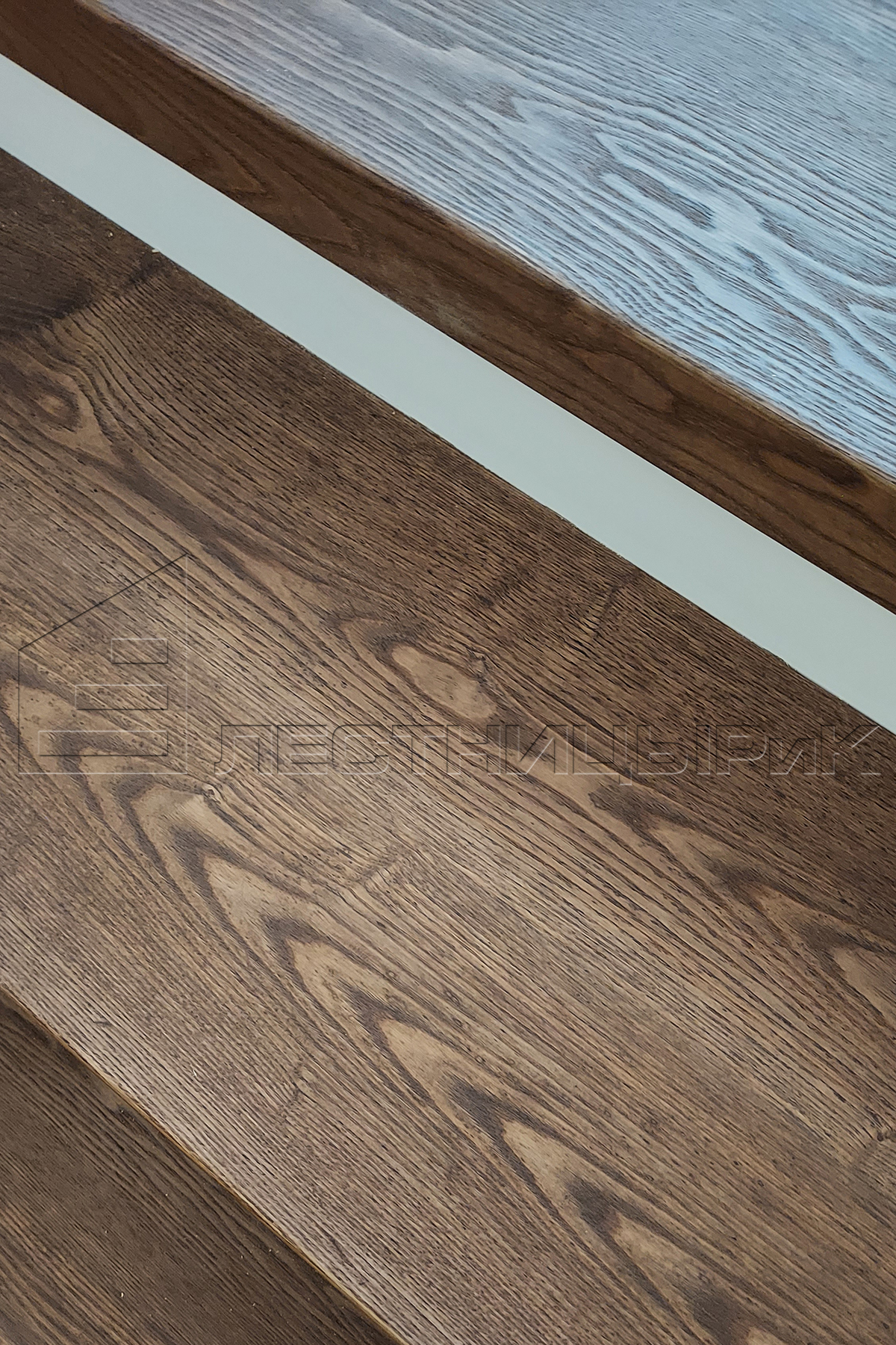 Выбрали вариант обшивки ясенем на контрасте с белыми подступенками.