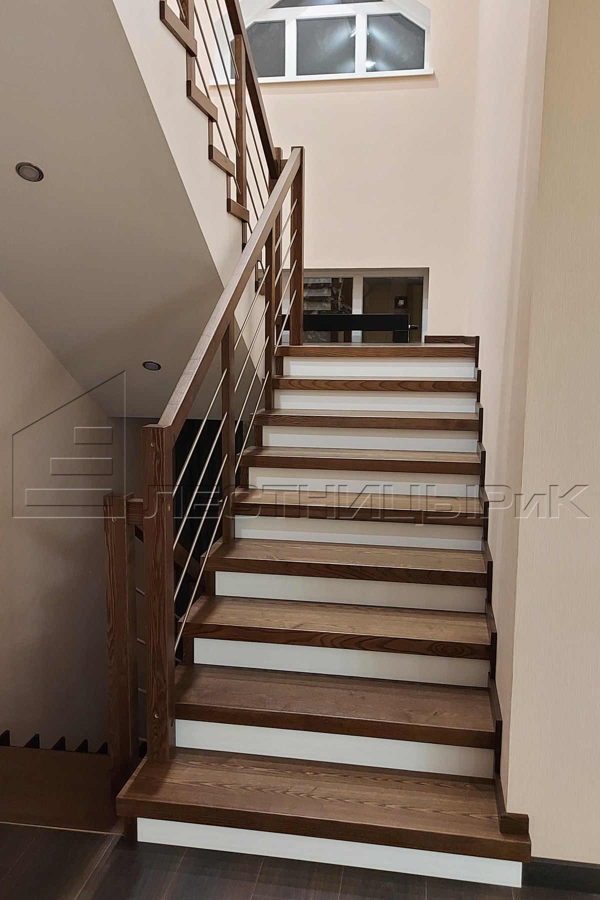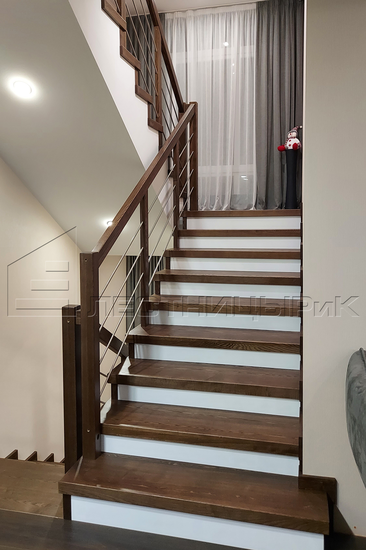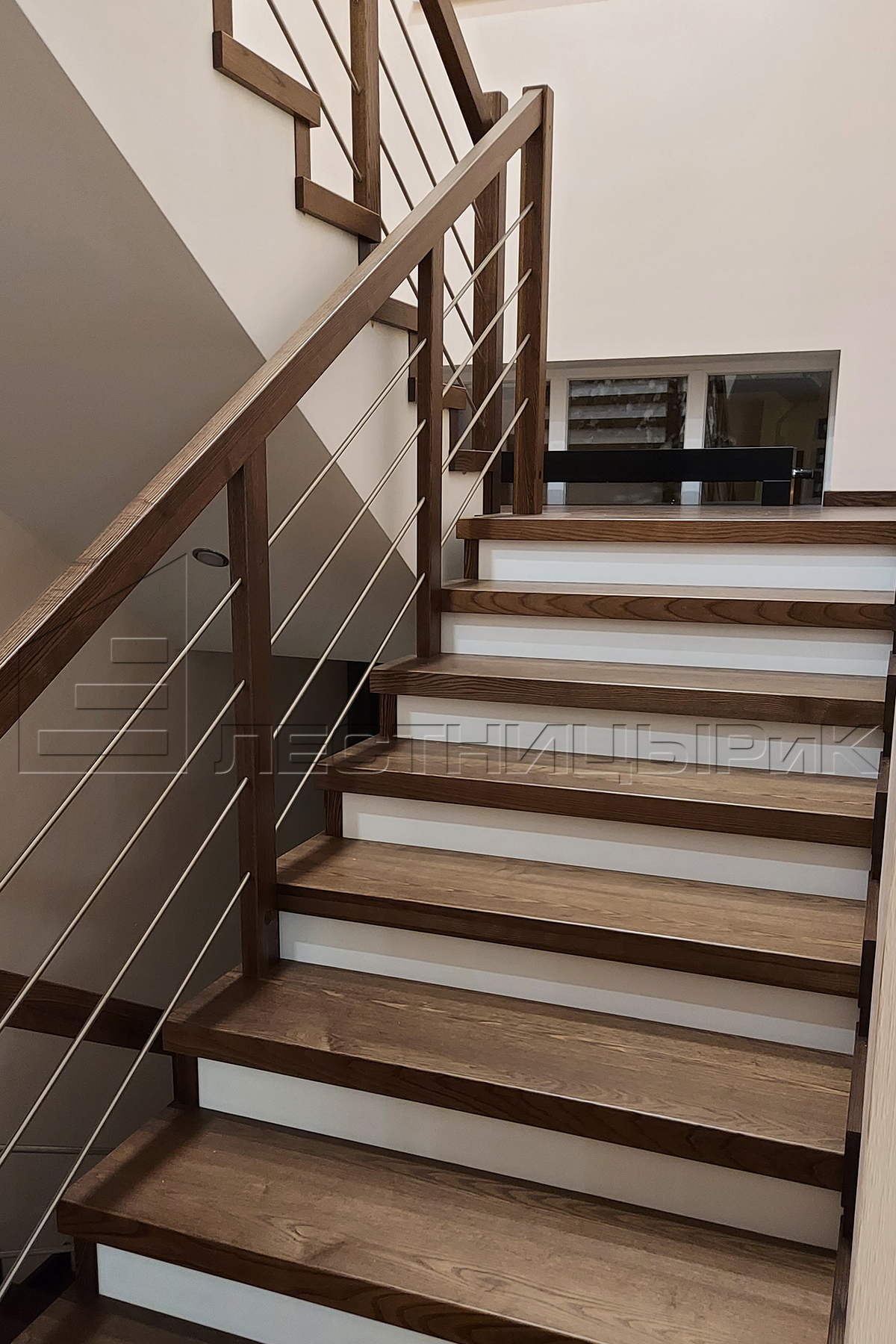 Ограждение лестницы — комбинированное, с ригелями из нержавеющей стали.