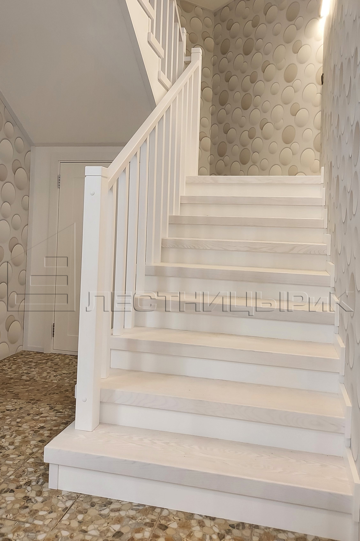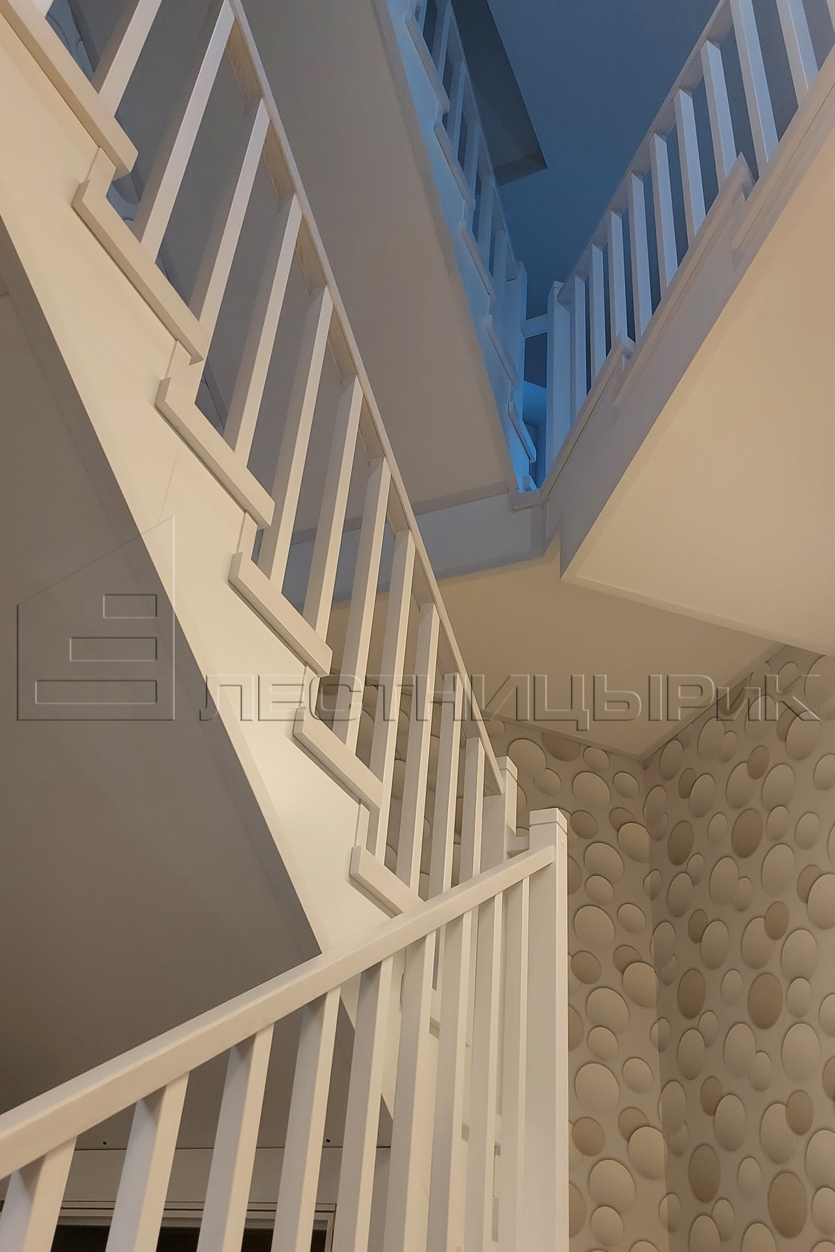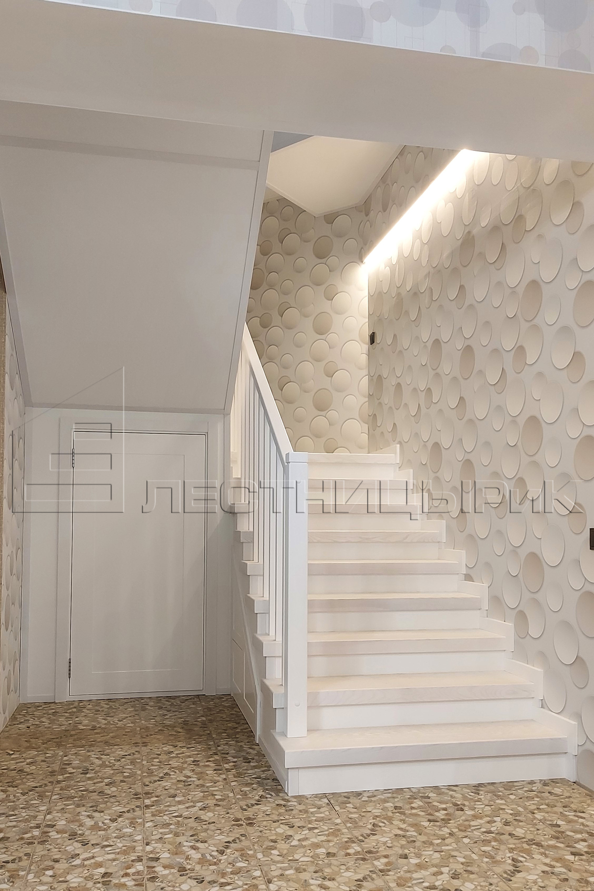 Белоснежная облицовка металлокаркасов с подшивками снизу и организацией подлестничного пространства на первом этаже.
