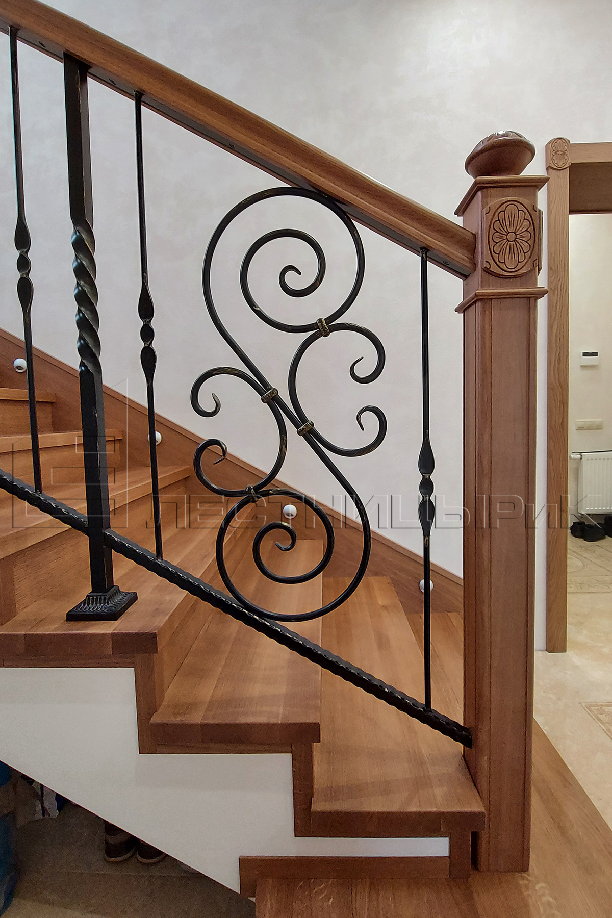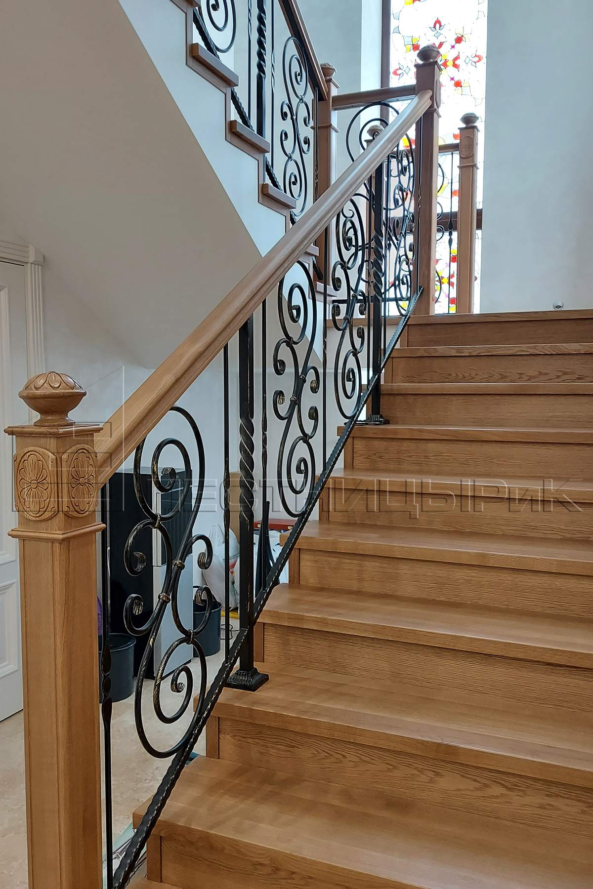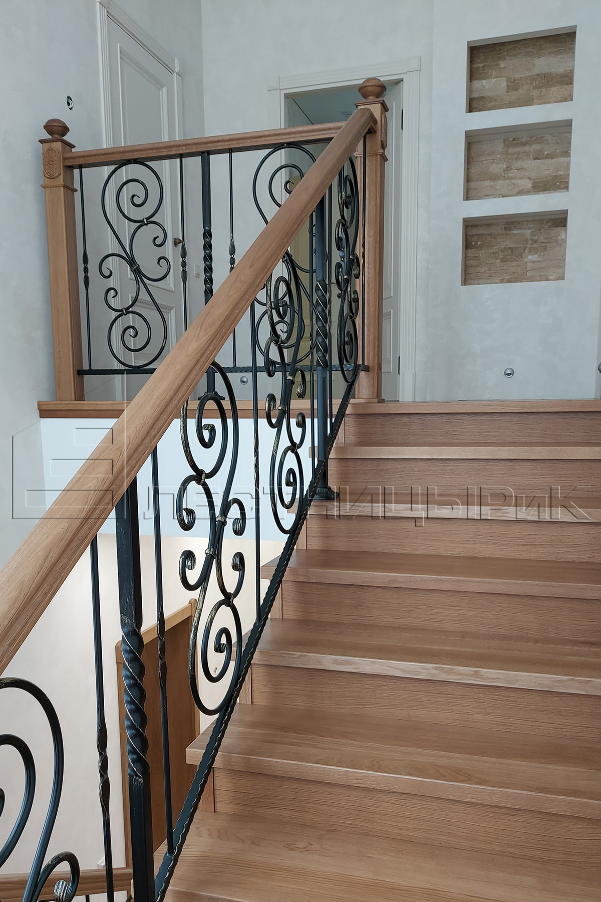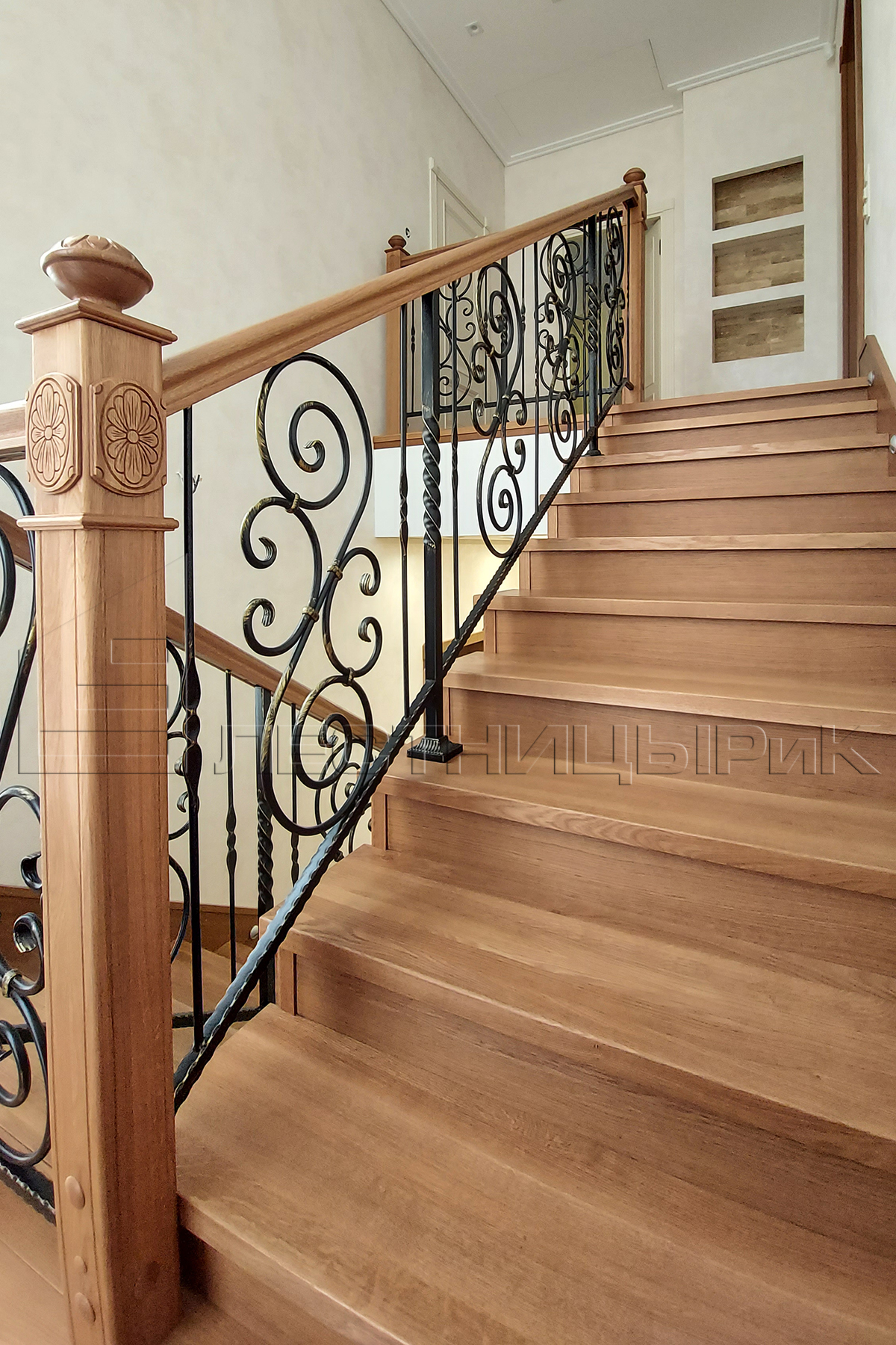 Облицовка бетона дубом с комбинированным ограждением массив плюс ковка. Скажем честно, было не просто, но мы справились с задачей.