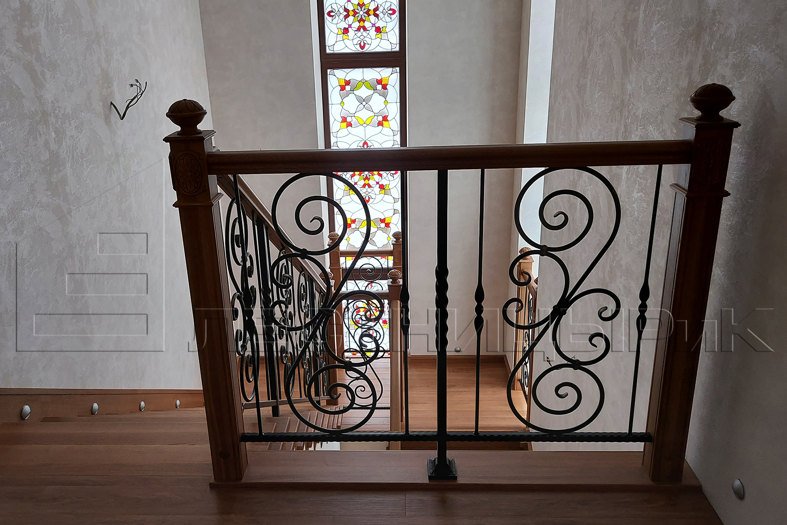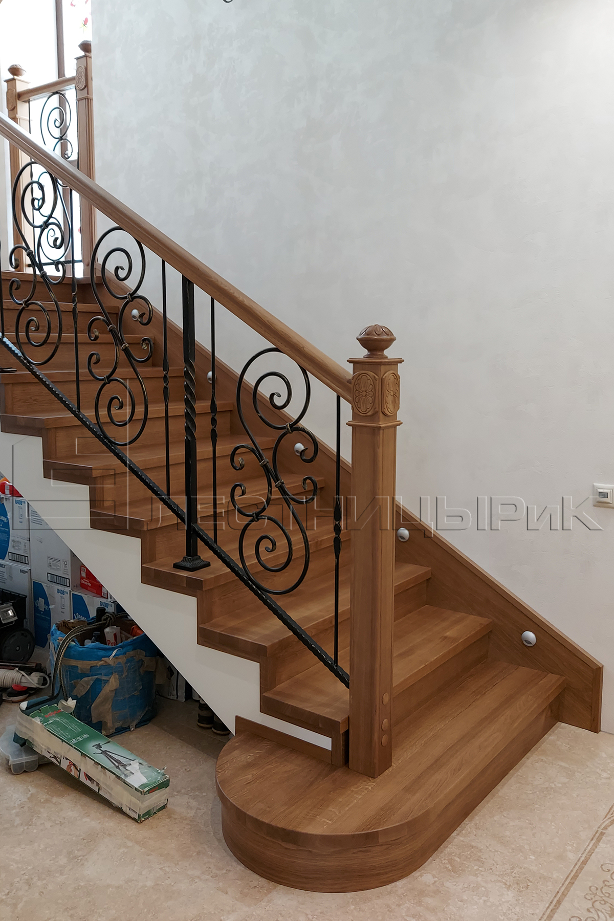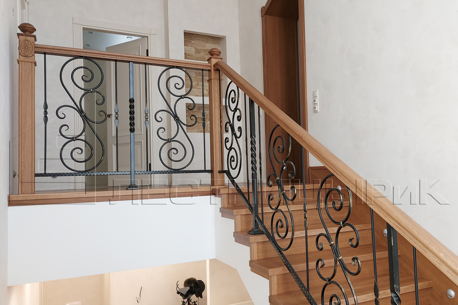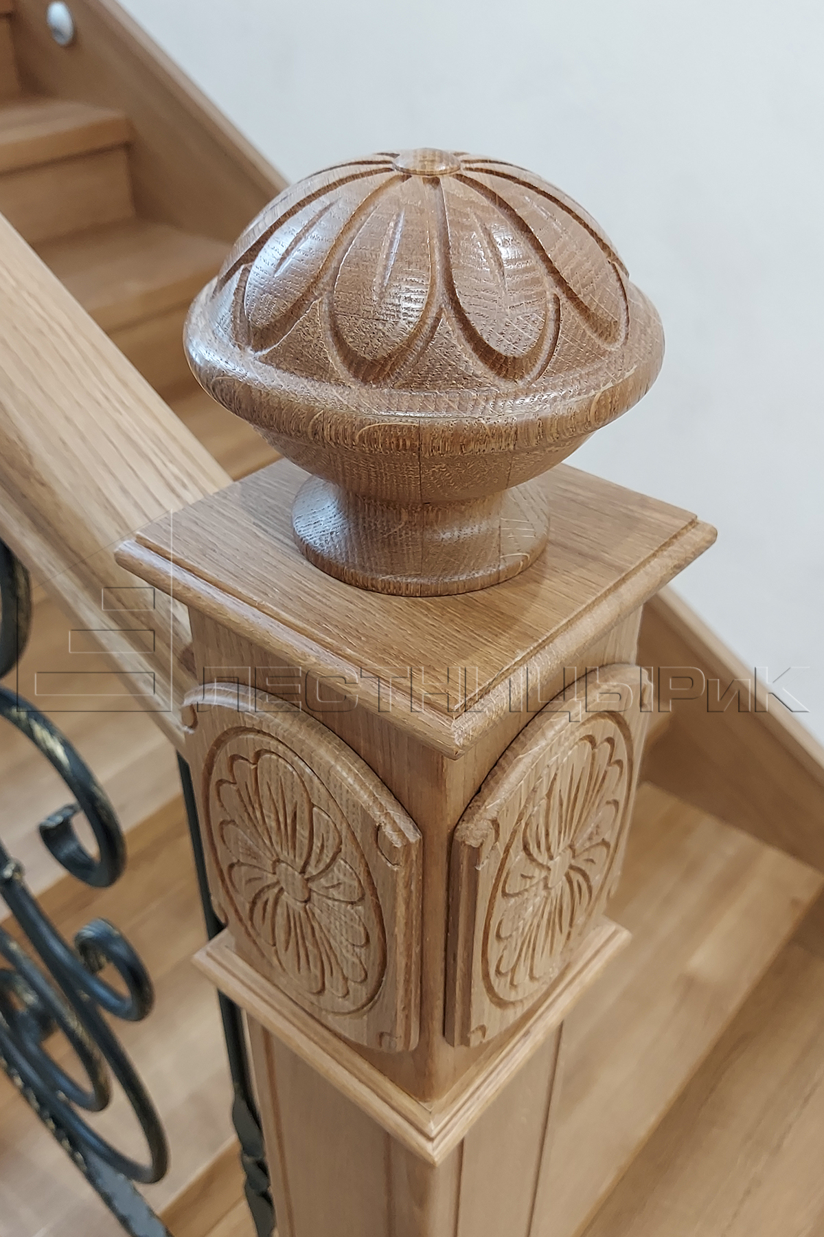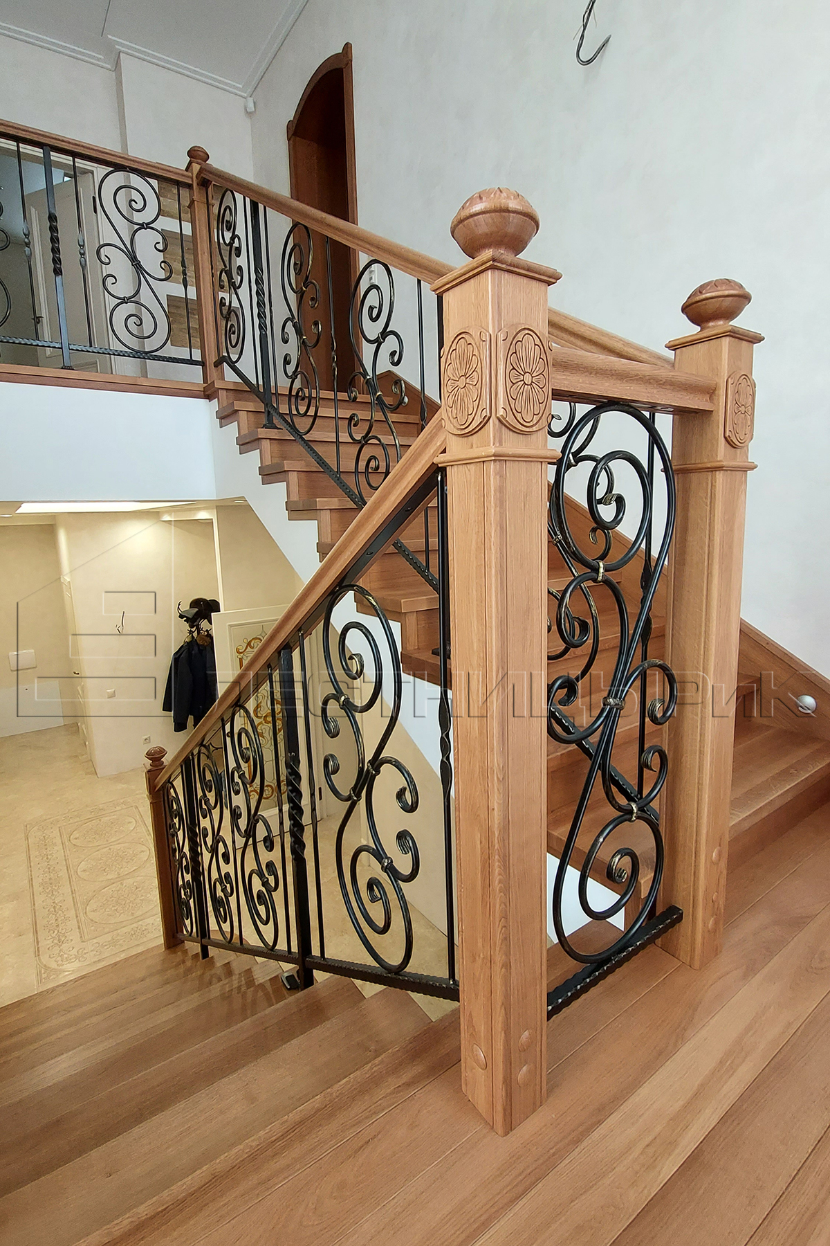 Облицовка бетона дубом с комбинированным ограждением массив плюс ковка. Скажем честно, было не просто, но мы справились с задачей.
