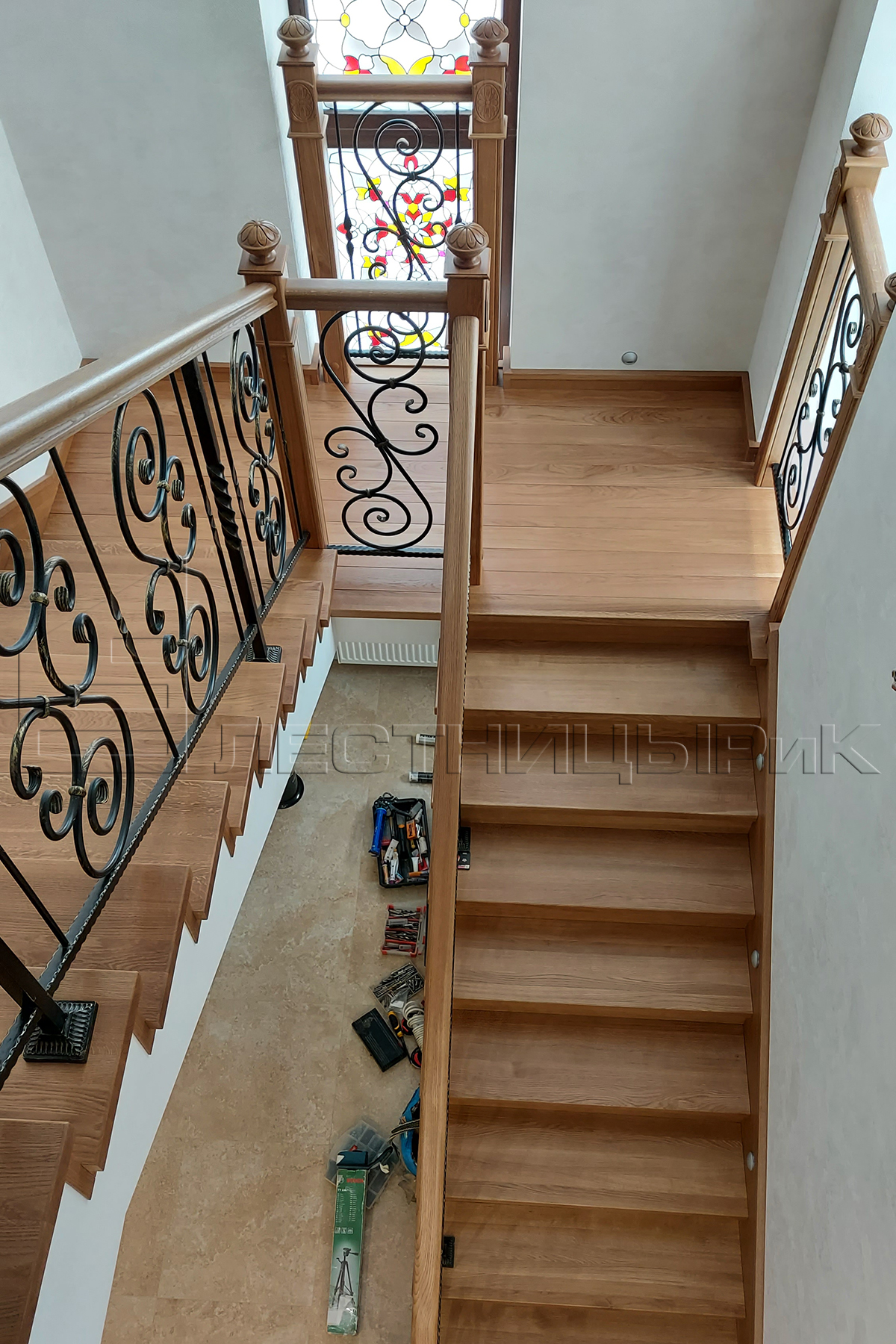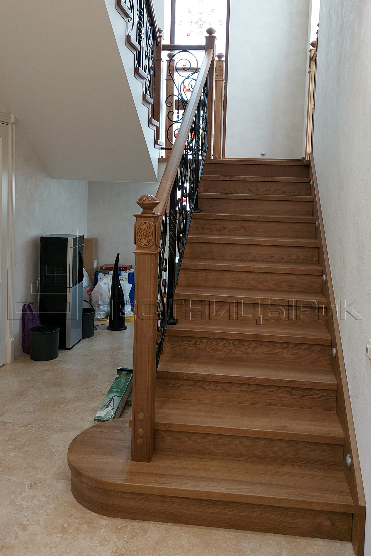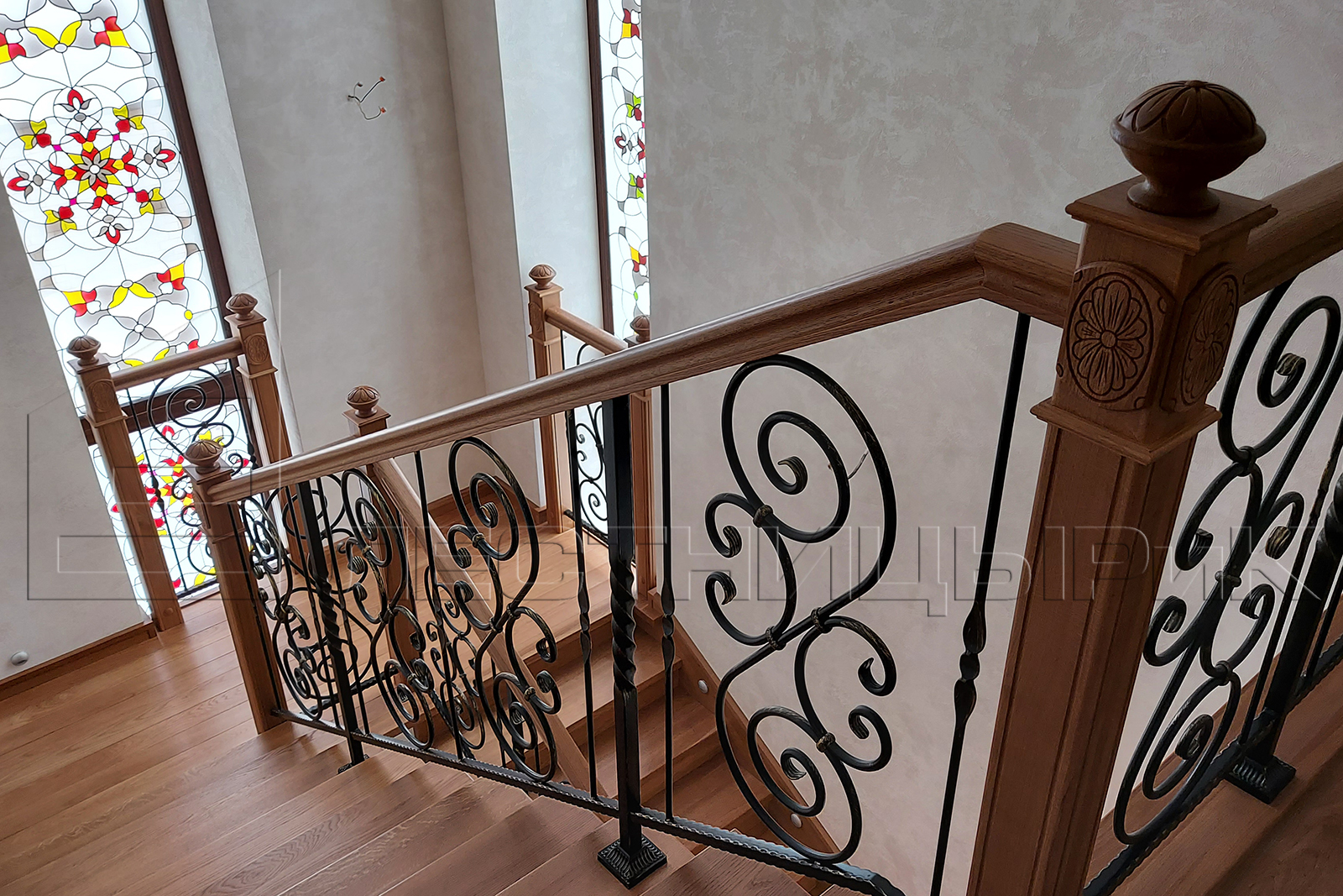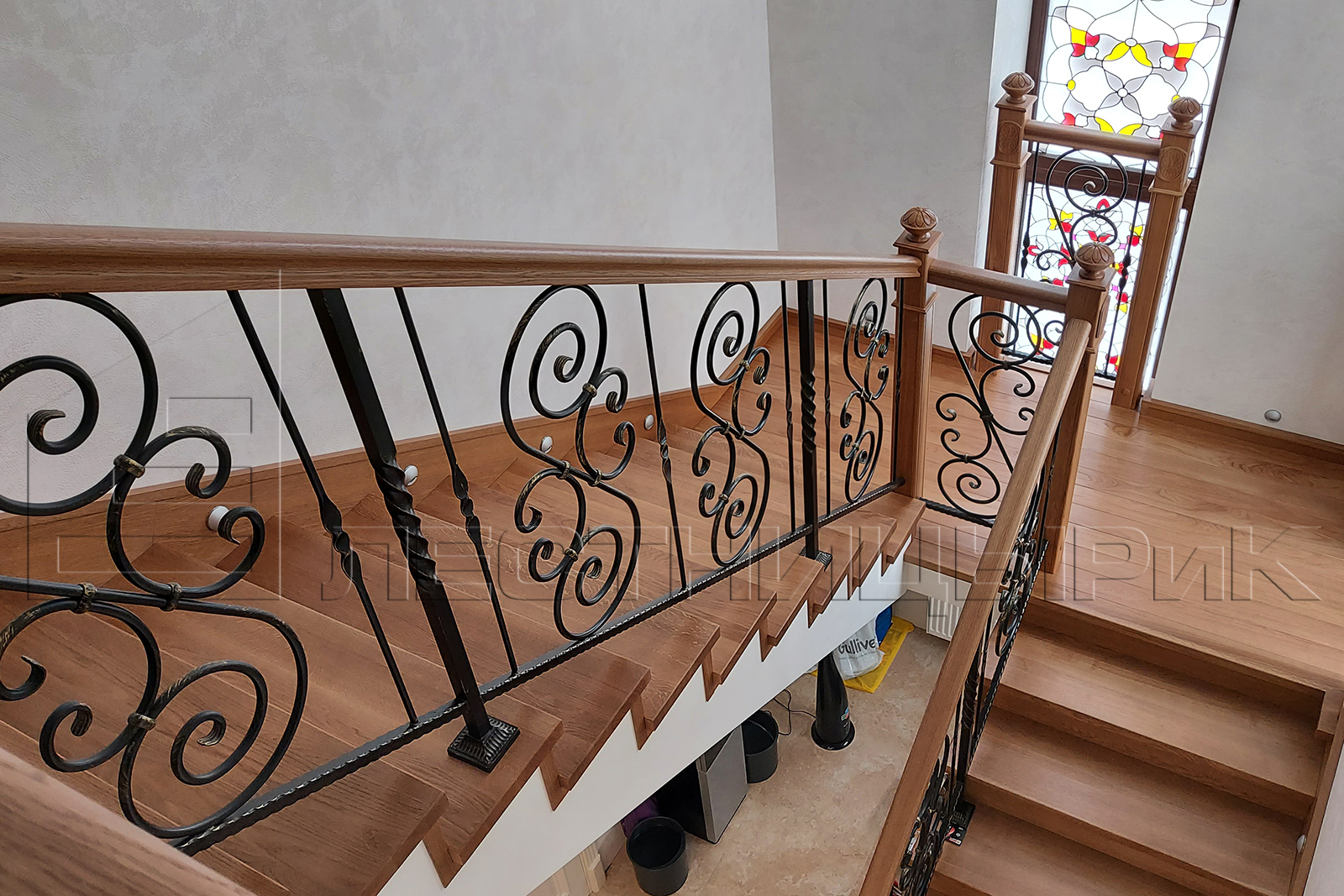 Облицовка бетона дубом с комбинированным ограждением массив плюс ковка. Скажем честно, было не просто, но мы справились с задачей.