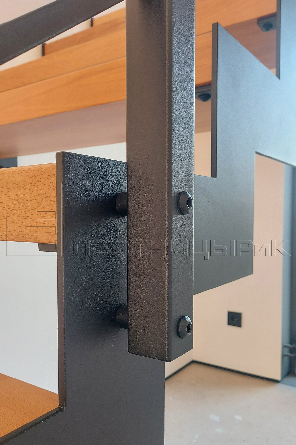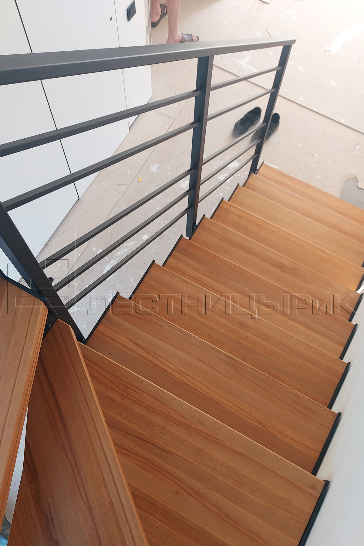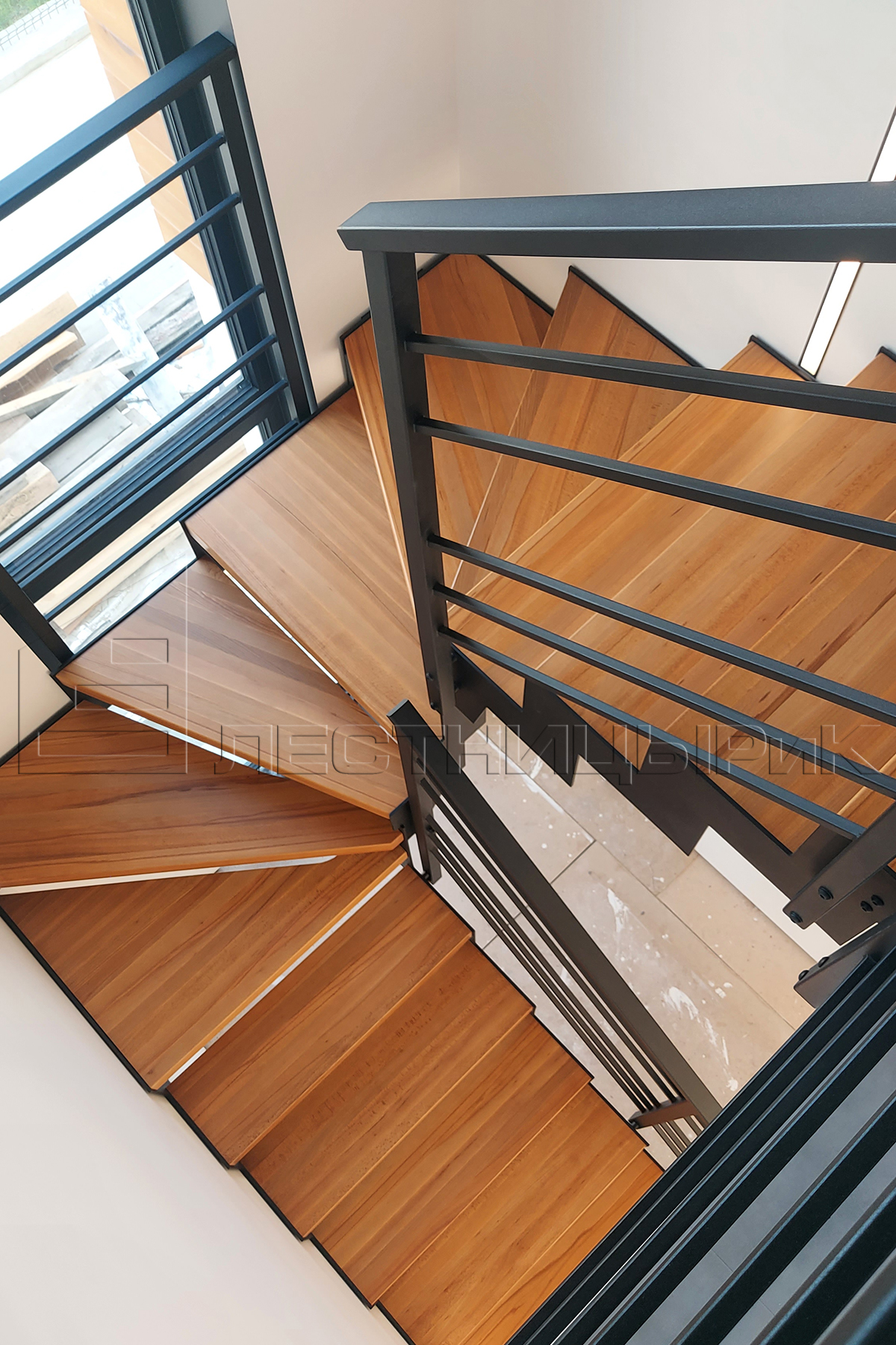 Реализовали лестницу в стиле лофт на открытом каркасе. Буковые ступени с рыжинкой очень хорошо подружились с черным металлом. Да и целом, лестница удачно вписалась в минималистичный интерьер дома. Однозначно рекомендуем такие решения для относительно небольших проемов. Можно поиграть цветами и формой ограждений, чтобы получить вариант, подходящий именно вам.
