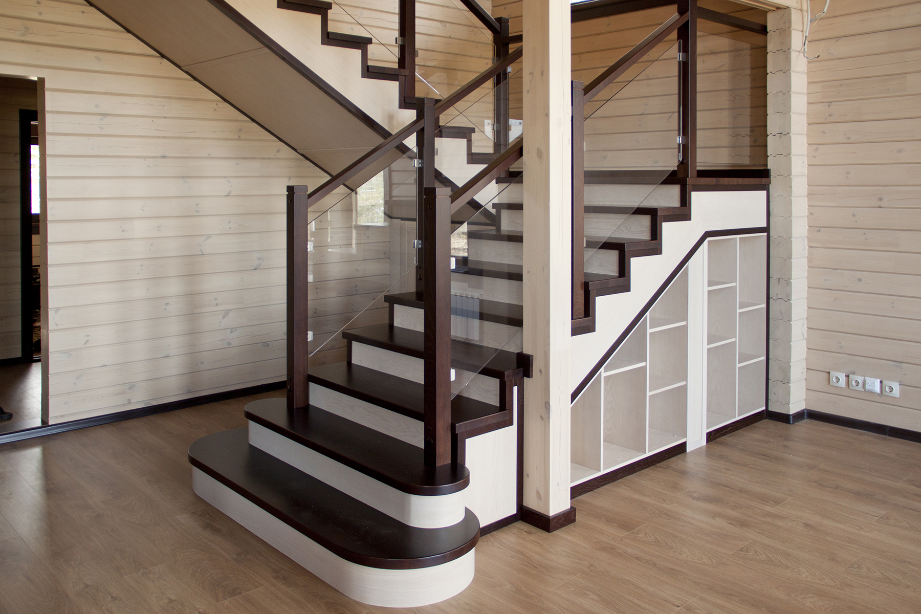 Комплексная обшивка металлокаркаса с установкой стеклянных ограждений и организацией подлестничного пространства в коттеджном поселке Лисьи горки.